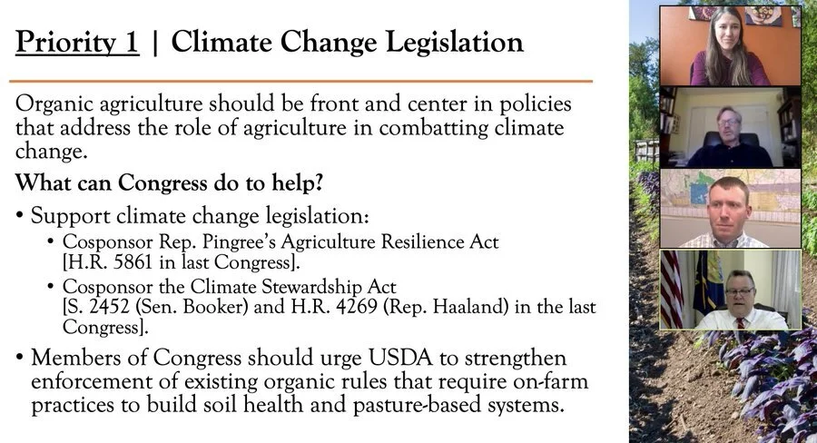 Climate Change: Many Congressional offices understood that organic operations have been early adopters of climate-friendly practices like cover cropping and crop rotations due to the strict soil health requirements in the organic regulations. Congressional offices joined NOC in recognizing the need to reward organic farmers and other early adopters, while at the same time calling on the USDA National Organic Program to ensure that the strict soil health provisions and pasture rule requirements in organic are adequately enforced. Several members of Congress committed to communicate with USDA to make sure that enforcement is happening as it should.