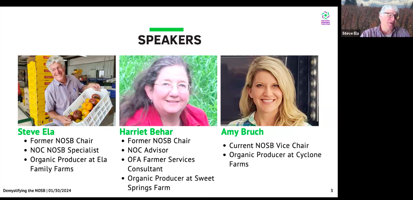 On Tuesday, January 30, 2024, NOC, in partnership with the Organic Farming Research Foundation and Organic Farmers Association*, hosted a virtual meeting for organic and transitioning farmers, where a panel of farmers and advocates demystified the NOSB. Panelists explained the role of the NOSB in shaping organic standards and allowed materials, the process the Board uses to make decisions, and explained how written and oral comments can make a difference in Board decisions.