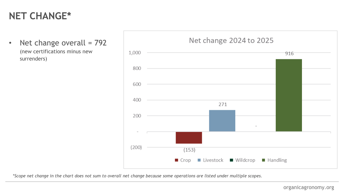 Mallory Krieger from the Organic Agronomy Training Service (OATS) analyzed the USDA Organic Integrity Database and found mixed news. From 2024 to 2025, we gained 3,539 newly certified operations but lost 2,825 that voluntarily surrendered—a net gain of 792 operations overall.